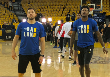 根據(jù)The Athletic記者Sam Amick報(bào)道,勇士在本場(chǎng)比賽前,特別訂做了印有“為了奧克蘭”字樣的球員熱身T-恤衫和毛巾(見新聞配圖),并為了支持此前受傷的球隊(duì)前鋒凱文-杜蘭特,特意將KD兩個(gè)字母印在最后,可以看作是“為了奧克蘭,為了KD”。